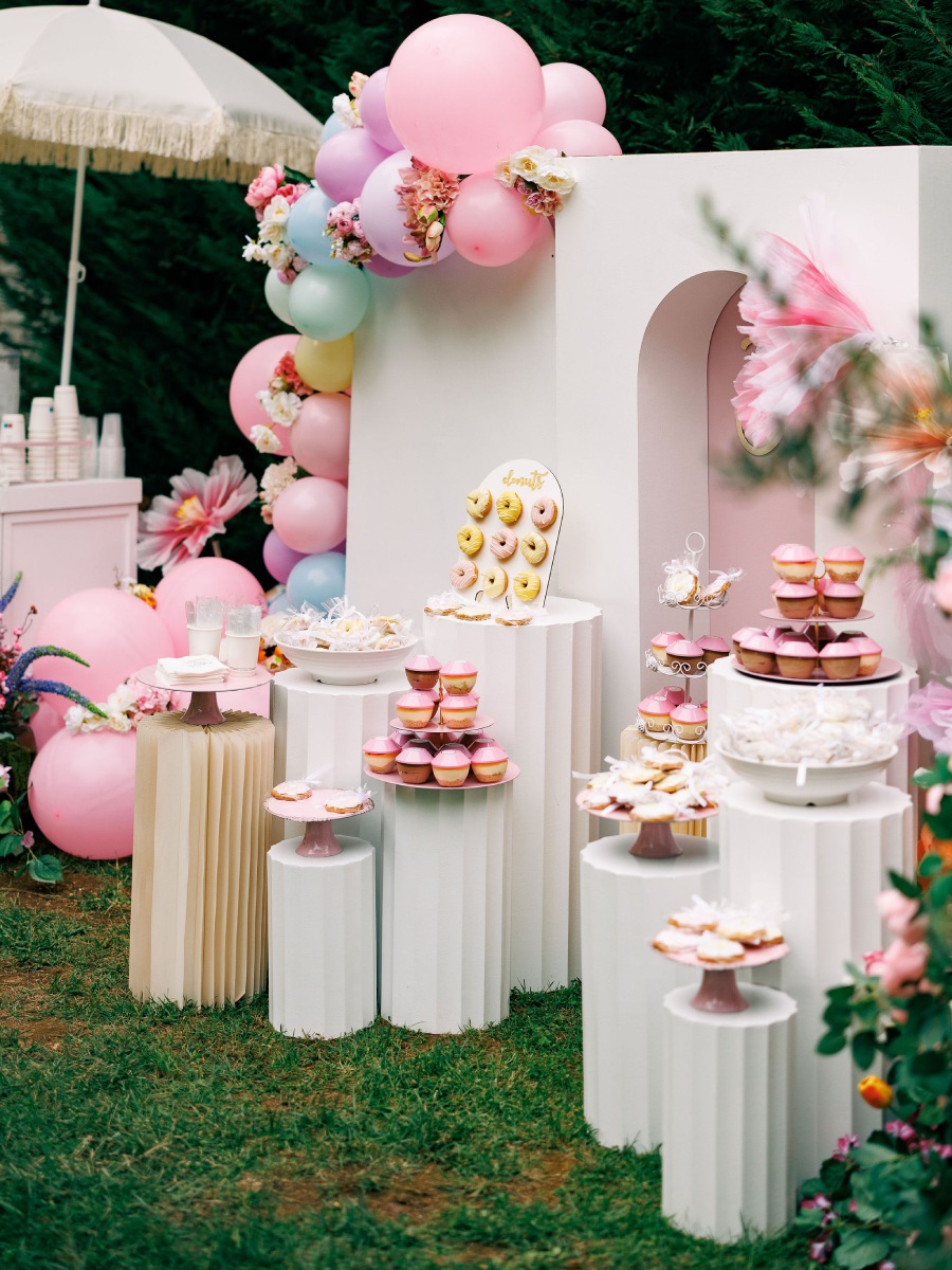 - Το candy bar τοποθετήθηκε μπροστά από το πυκνό πράσινο φόντο, δημιουργώντας έντονη χρωματική αντίθεση με τις παστέλ αποχρώσεις.
